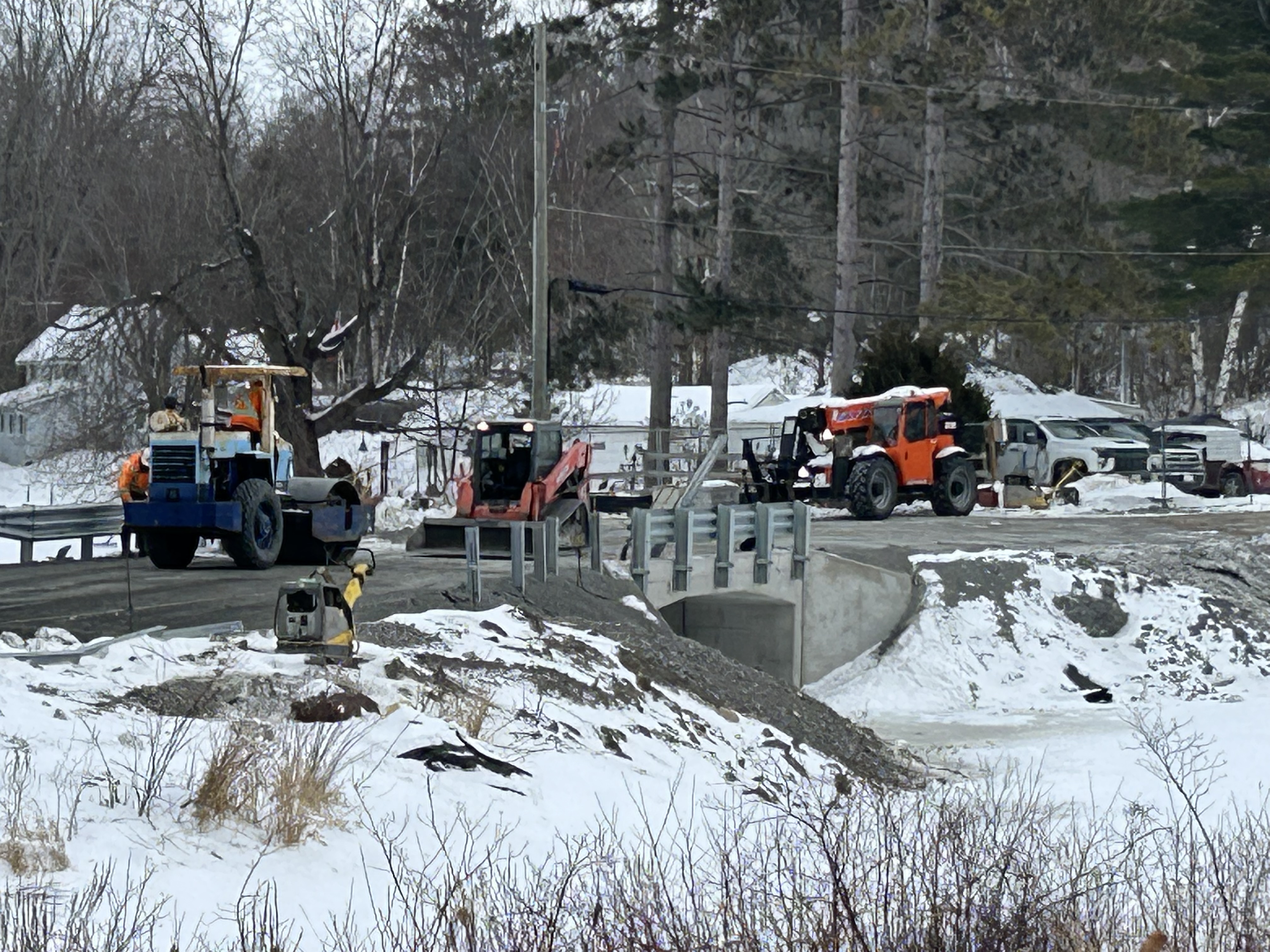 The Fish Creek Bridge construction is near complete, and the road is scheduled to be re-opened with a temporary gravel surface at the end of the day at dusk on Friday, January 30. The causeway and the bridge deck will be paved in late spring when asphalt plants re-open. Please see updates on recently completed work along with and works scheduled for next week: