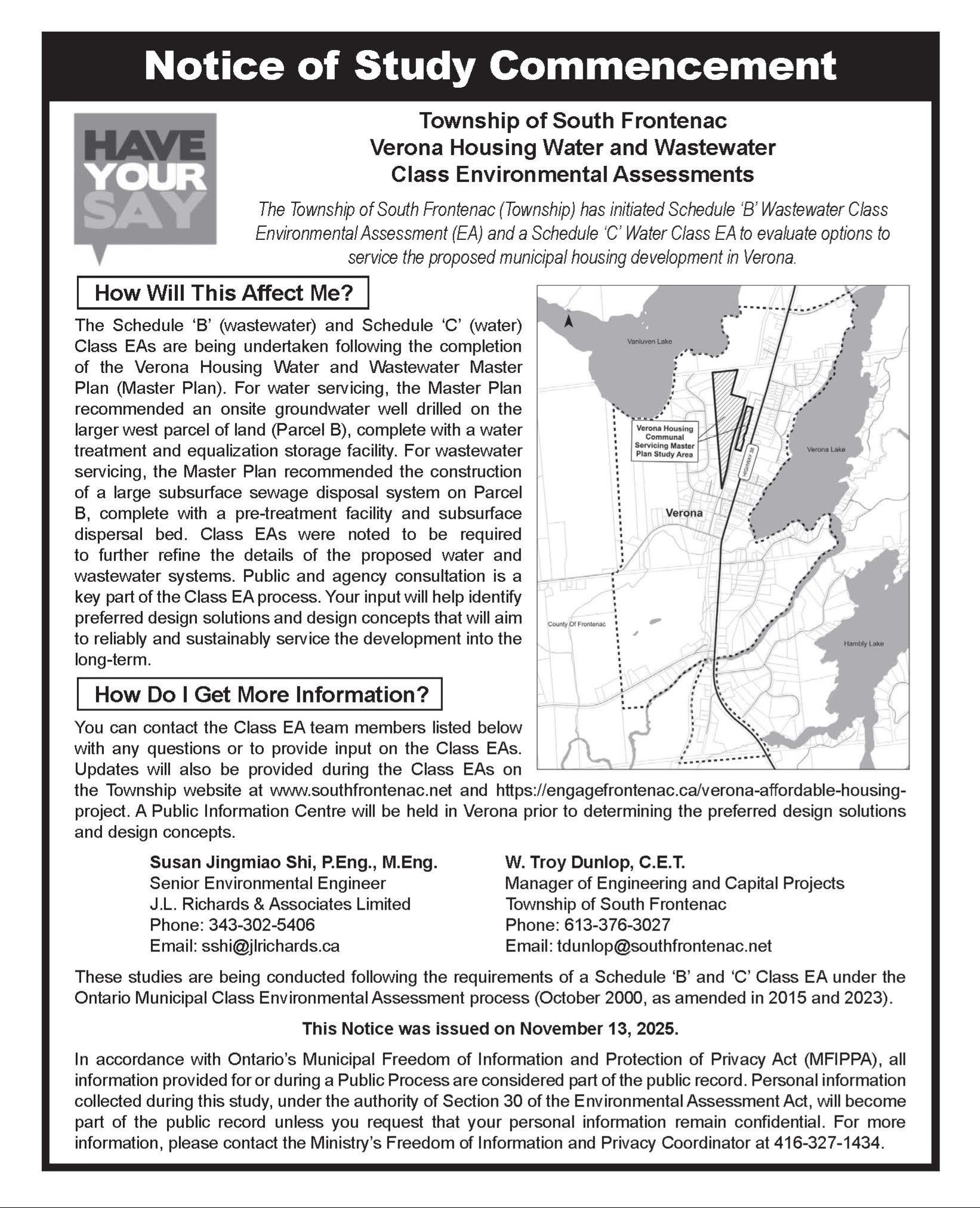 The Township of South Frontenac is currently advancing the next phases of environmental studies required in support of the servicing proposals for the Verona Housing Master Plan. J. L. Richards & Associates have been retained by the Township to advance the individual Municipal Class Environmental Assessments for proposed water and wastewater systems as required under Ontario’s Environmental Assessment Act.